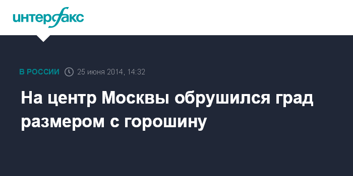 Москва. 25 июня. INTERFAX.RU - В центральной части Москвы идет сильный град. Как передает корреспондент "Интерфакса", в центральной части Москвы вместе с ливнем пошел град размером с крупную горошину.