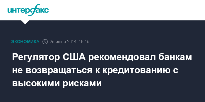 Москва. 25 июня. INTERFAX.RU - Управление контролера валютного обращения (Office of the Comptroller of Currency, OCC) США рекомендовало банкам не возвращаться к операциям кредитования с повышенными рисками в погоне за сохранением прибыльности на фоне замедления экономического роста и ужесточения регулирования.