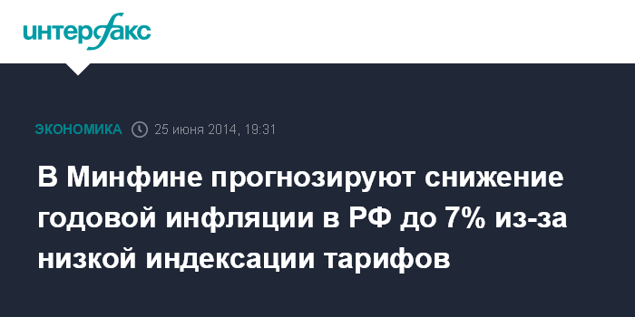 Москва. 25 июня. INTERFAX.RU - Нулевая индексация тарифов для промышленных пользователей и более сдержанная индексация для домохозяйств снизит уровень годовой инфляции в июле 2014 года на 0,6 процентного пункта (п.п.), полагает директор департамента долгосрочного стратегического планирования Минфина Максим Орешкин.