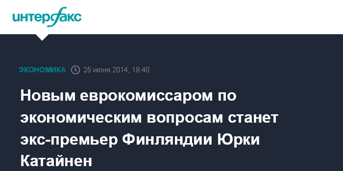 Москва. 25 июня. INTERFAX.RU - Ушедший с поста премьер-министра Финляндии Юрки Катайнен назначен новым комиссаром Евросоюза по экономическим и монетарным вопросам, заявил в среду председатель Европейской комиссии Жозе Мануэл Баррозу, слова которого передает агентство Bloomberg.