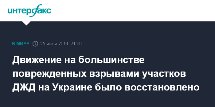 Москва. 25 июня. INTERFAX.RU - Железнодорожники восстановили движение поездов на семи перегонах Донецкой железной дороги (ДЖД), пострадавших вследствие взрывов, однако несанкционированные вмешательства в работу железнодорожного транспорта продолжаются.