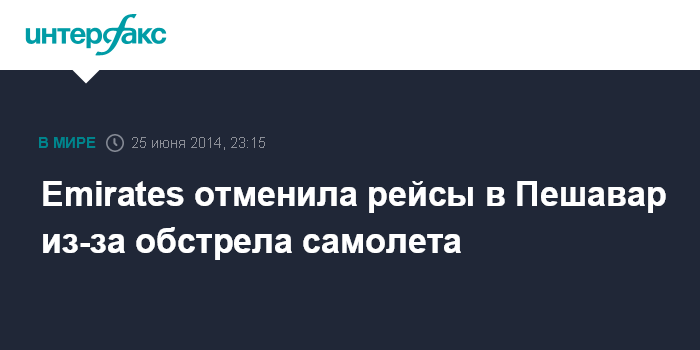Москва. 25 июня. INTERFAX.RU - Дубайская авиакомпания Emirates приостановила полеты в пакистанский Пешавар из соображений безопасности - накануне боевики расстреляли приземлявшийся самолет, сообщает BBC.