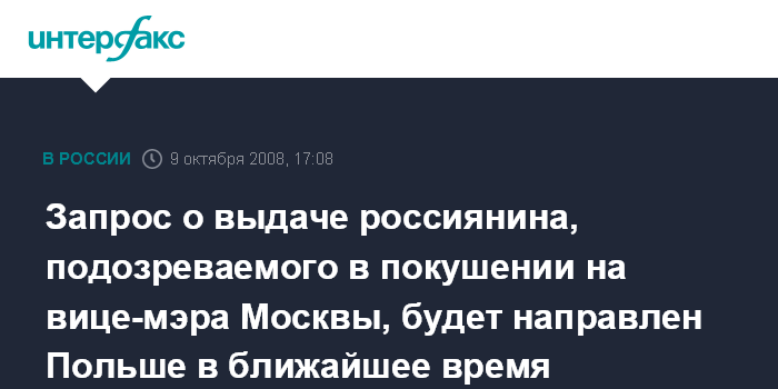 Москва. 9 октября. INTERFAX.RU – Генеральная прокуратура России в ближайшее время направит запрос о выдаче задержанного в Польше россиянина, подозреваемого в покушении на вице-мэра Москвы Иосифа Орджоникидзе.