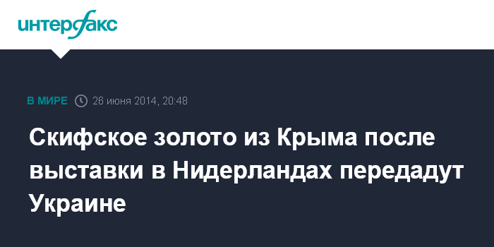 Москва. 26 июня. INTERFAX.RU - Все музейные предметы, переданные для экспонирования на выставке "Крым - золотой остров в Черном море" земельному краеведческому музею в г.Бонн и археологический музей Амстердамского университета "Аллард Пирсон", вернутся в Украину, сообщает Министерство культуры Украины.