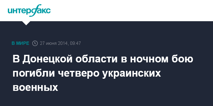 Москва. 27 июня. INTERFAX.RU - Четверо украинских военных погибли и еще пятеро получили ранения в результате боя в районе блокпоста близ Краматорска Донецкой области, сообщает руководитель базирующейся в Киеве группы "Информационное сопротивление" Дмитрий Тымчук.