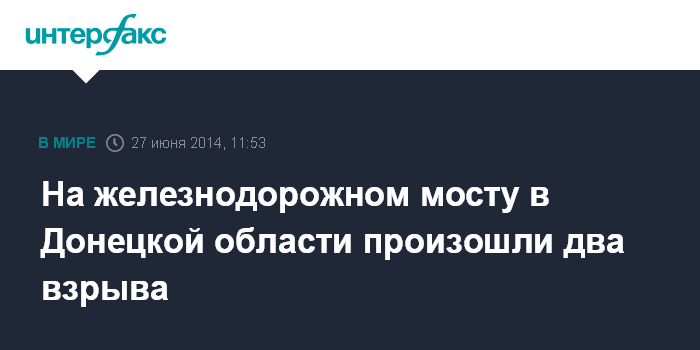 Москва. 27 июня. INTERFAX.RU - Два взрыва на железнодорожном мосту между входным светофором и стрелочным переводом произошли 27 июня в 04:45 и 05:20 (05:45 и 06:20 по Москве) на станции Огородный Донецкой железной дороги.