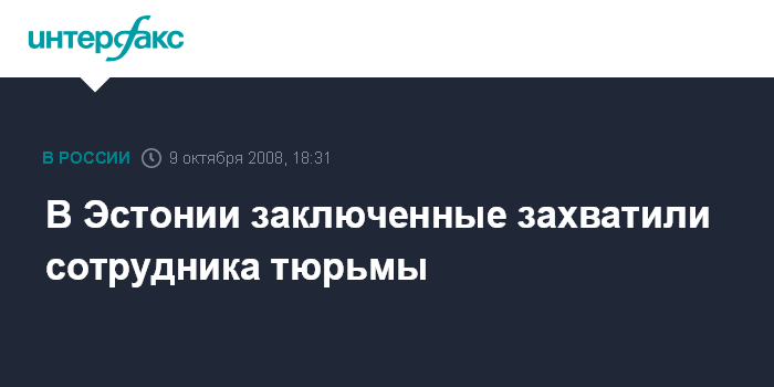 Москва. 9 октября. INTERFAX.RU - В Эстонии в Вируской (Viru) тюрьме в четверг двое заключенных взяли в заложники тюремного педагога. Как сообщил "Интерфаксу" пресс-секретарь министерства юстиции Эстонии Март Сииливаск (Mart Siilivask), заложник был захвачен около 13:52 по местному времени (14:52 мск).