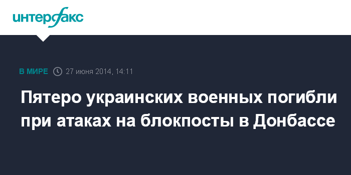 Москва. 27 июня. INTERFAX.RU - В ходе атак на блокпосты военных в зоне проведения силовой операции на востоке Украины погибли пять украинских силовиков, сообщил представитель информационного центра Совета национальной безопасности и обороны Украины Андрей Лысенко на брифинге в пятницу в Киеве.