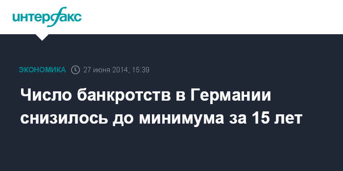 Москва. 27 июня. INTERFAX.RU - Число зарегистрированных в Германии предприятий и компаний, объявивших о несостоятельности с начала года, сократилось на 9,1% по сравнению с тем же периодом 2013 года - до 12,1 тыс., передает Deutsche Welle. По данным кредитного агентства Creditreform, это наименьшее число банкротов со времени вступления в силу закона о несостоятельности 1999 года.