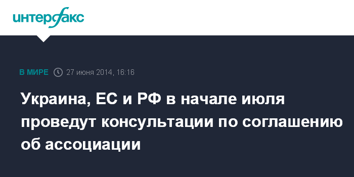 Москва. 27 июня. INTERFAX.RU - В начале июля Украина, Евросоюз и Россия проведут консультации на экспертном и министерском уровнях относительно последствий подписания Киевом соглашения об ассоциации с ЕС, заявил президент Петр Порошенко.