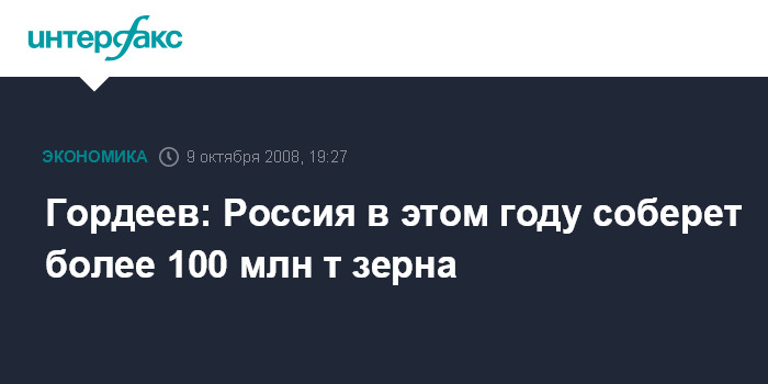 Москва. 9 октября. ИНТЕРФАКС - Россия в этом году соберет более 100 млн тонн зерна в чистом весе, сообщил министр сельского хозяйства РФ Алексей Гордеев на пресс-конференции в четверг в Москве.