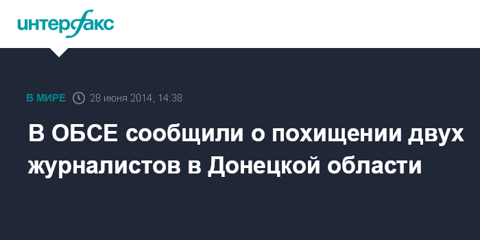 Москва. 28 июня. INTERFAX.RU - В ОБСЕ располагают данными о похищении двух украинских журналистов в Донецкой области, заявила в субботу представитель организации по вопросам свободы СМИ Дунья Миятович.