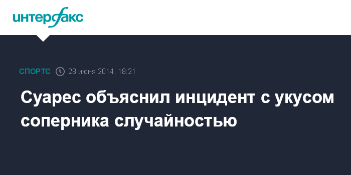 Москва. 28 июня. INTERFAX.RU - Нападающий сборной Уругвая по футболу Луис Суарес заявил, что он не кусал итальянского защитника Джорджо Кьеллини, а просто ударился о его плечо зубами.