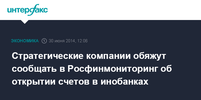 Москва. 30 июня. INTERFAX.RU – Стратегические компании могут обязать сообщать в Росфинмониторинг об открытии счетов в иностранных банках. Также планируется введение штрафов до 60 млн рублей за открытие такими компаниями счетов в банках, которые не соответствуют определенным требованиям.