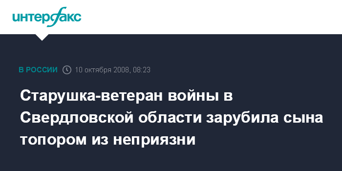 Москва. 10 октября. INTERFAX.RU - В деревне Приданниково Красноуфимского района Свердловской области 84-летняя старушка зарубила топором своего 53-летнего сына.