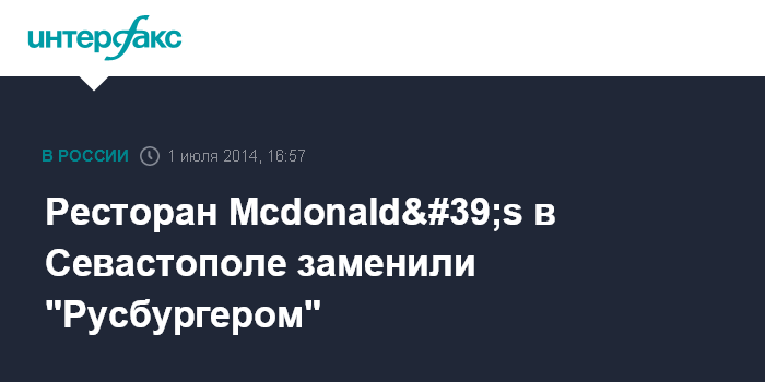 Москва. 1 июля. INTERFAX.RU - Компания "Русбургер" открывает ресторан в Севастополе в помещении, где раньше работал ресторан сети Mcdonald's, сообщил "Интерфаксу" директор "Русбургера" по развитию Георгий Асланян.
