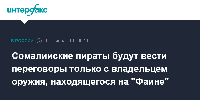 Москва. 10 октября. INTERFAX.RU - Сомалийские пираты, захватившие украинское судно "Фаина" с военной техникой на борту, выдвинули новое требование: на сей раз бандиты заявили, что будут вести переговоры только с владельцем оружия, а не владельцем судна.
