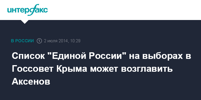 Москва. 2 июля. INTERFAX.RU - Исполняющий обязанности главы Республики Крым Сергей Аксенов может возглавить список "Единой России" на выборах в Госсовет Крыма, которые запланированы на единый день голосования 14 сентября. Об этом сообщил секретарь регионального отделения партии, спикер Госсовета Крыма Владимир Константинов.