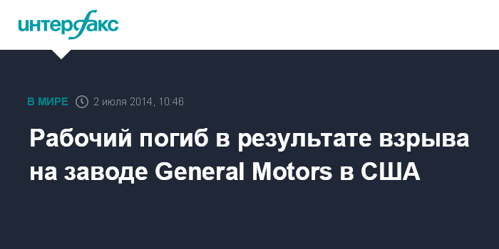 Москва. 2 июля. INTERFAX.RU - Химический взрыв на предприятии General Motors Co. (GM) в штате Индиана унес жизнь одного рабочего, сообщает агентство Bloomberg.