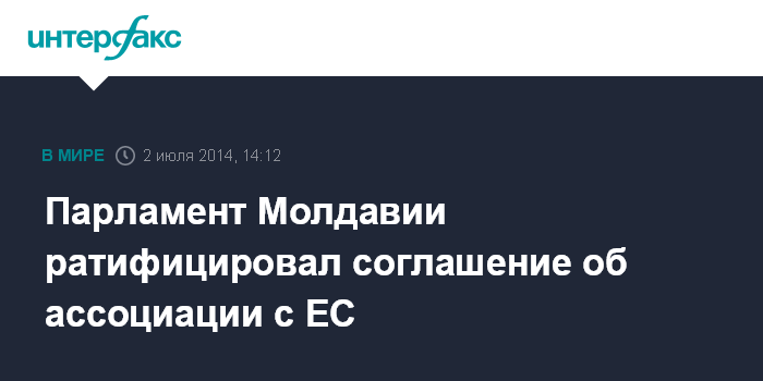 Москва. 2 июля. INTERFAX.RU - Парламент Молдавии на заседании в среду проголосовал за ратификацию соглашения об ассоциации с ЕС. За ратификацию документа в ходе специального заседания парламента проголосовали 59 депутатов, против - четверо.