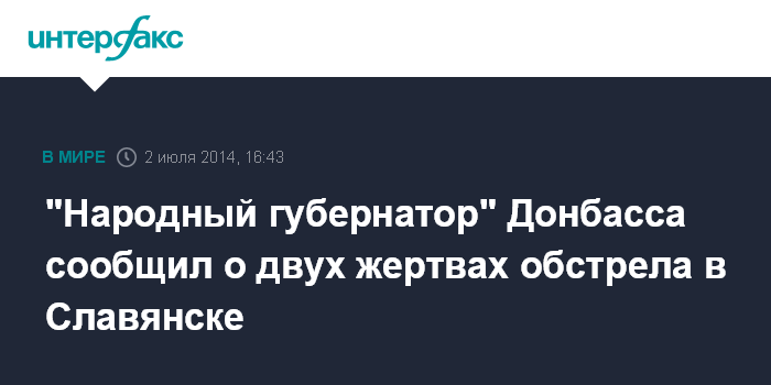 Москва. 2 июля. INTERFAX.RU - В Славянске обстреляли гражданский автобус, в результате чего погибли два человека, сообщил "народный губернатор" Донбасса Павел Губарев со ссылкой на лидера ополчения самопровозглашенной "Донецкой народной республики" Игоря Стрелкова.