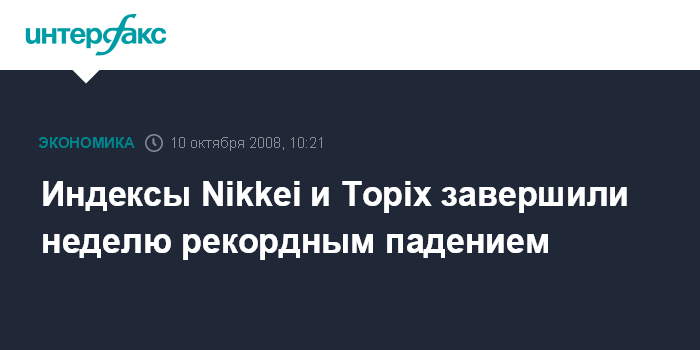 Москва. 10 октября. INTERFAX.RU - Падение японских фондовых индексов по итогам недели стало рекордным за всю историю их существования: Nikkei 225 Average потерял за неделю 20%, TOPIX - 24%, сообщило агентство Bloomberg.