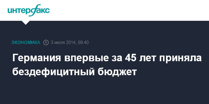 Москва. 3 июля. INTERFAX.RU - Правительство Германии в среду одобрило бездефицитный бюджет на 2015 год, предложенный министром финансов Вольфгангом Шойбле. Впервые с 1969 года в Германии был принят сбалансированный бюджет, не предусматривающий роста государственного долга страны, сообщает Deutsche Welle.