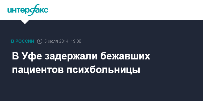 Москва. 5 июля. INTERFAX.RU - Полицейские в Уфе задержали двух сбежавших пациентов психиатрической больницы, сообщила пресс-служба МВД по Башкирии в субботу. В ходе поисков экипаж ГИБДД обнаружил их на дороге около поселка Авдон. В настоящие время беглецы помещены в лечебное учреждение.