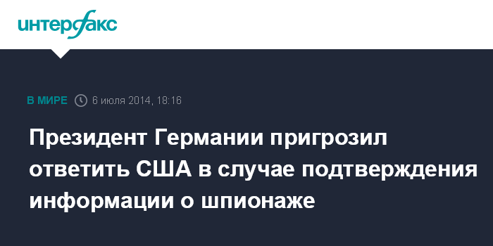 Москва. 6 июля. INTERFAX.RU - Германия готова будет решительно ответить Соединенным Штатам, в случае подтверждения факта ведения Вашингтоном разведывательной деятельности против Берлина, заявил президент Германии Йоахим Гаук. Если подтвердится, что США "давали такое задание одному из сотрудников нашей разведки, то действительно надо будет заявить: все, хватит!", сказал он в интервью телеканалу ZDF.