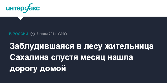 Москва. 7 июля. INTERFAX.RU - Жительница поселка Тымовское, которая почти месяц назад пропала на севере Сахалина, в минувшую субботу сама вышла из леса. Об этом агентству "Интерфакс" сообщили в отделе по делам ГО и ЧС Тымовского района.