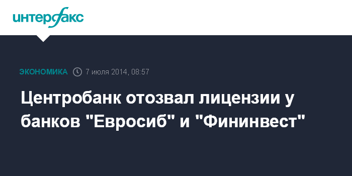 Центробанк отозвал лицензии у банков "Евросиб" и "Фининвест"