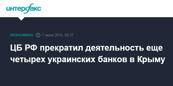 Москва. 7 июля. INTERFAX.RU - ЦБ России в связи с неисполнением обязательств перед кредиторами прекратил деятельность 4 украинских банков в Крыму и Севастополе, сообщается в пресс-релизе Центробанка. Решение принято 7 июля.