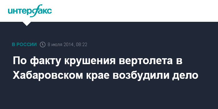 Москва. 8 июля. INTERFAX.RU - По факту крушения Ми-8 в Хабаровском крае возбуждено уголовное дело по части 1 статьи 263 УК РФ (нарушение правил безопасности движения и эксплуатации воздушного транспорта).