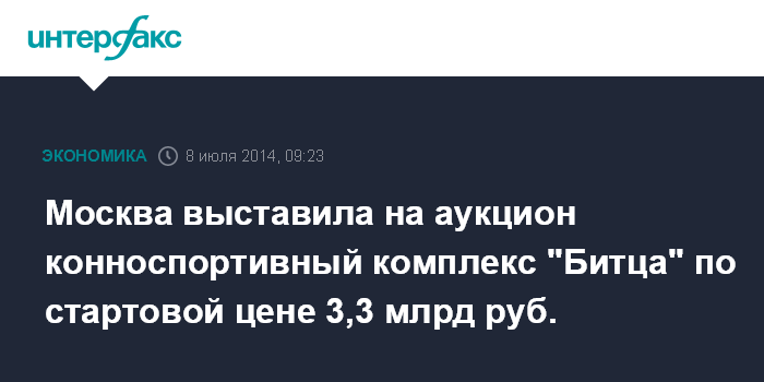 Москва. 8 июля. INTERFAX.RU – Власти Москвы выставили на аукцион 100% уставного капитала ОАО "Конноспортивный комплекс "Битца", сообщили "Интерфаксу" в пресс-службе тендерного комитета столицы во вторник. Аукцион состоится 14 августа.