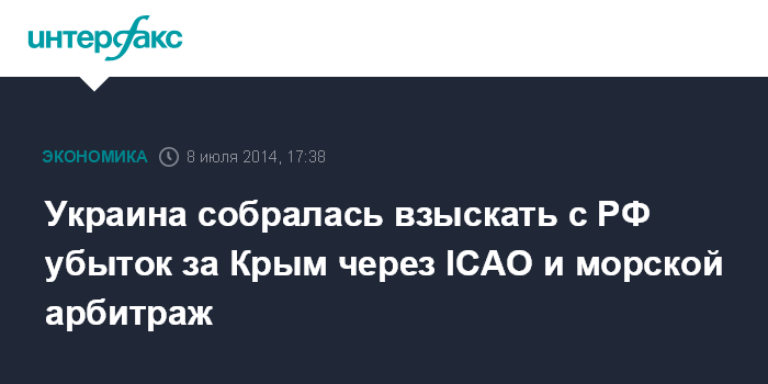 Москва. 8 июля. INTERFAX.RU - Киев обратился с жалобой в Международную организации гражданской авиации (ICAO) и Международный морской арбитраж, чтобы истребовать у России возмещения убытков в связи с Крымом.