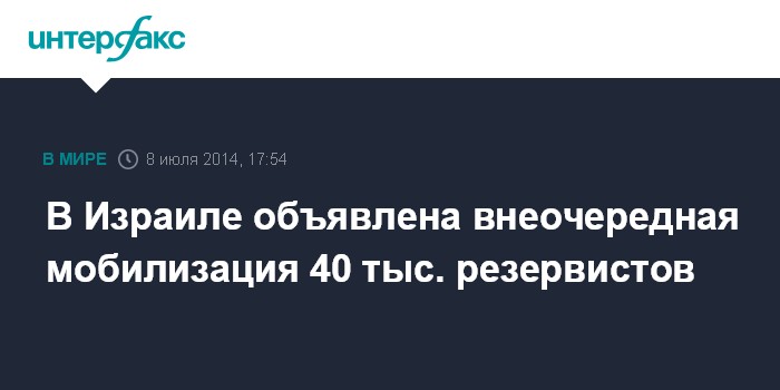 Москва. 8 июля. INTERFAX.RU - Кабинет по безопасности и обороне Израиля уполномочил военное командование провести мобилизацию 40 тыс. резервистов для подготовки наземной операции в секторе Газа, пишет во вторник газета The Jerusalem Post.