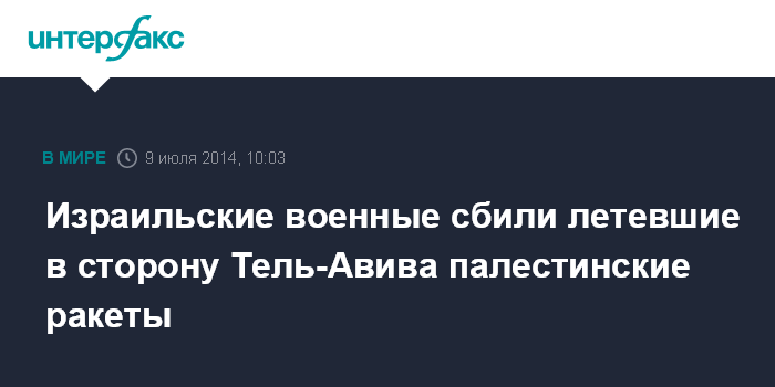 Москва. 9 июля. INTERFAX.RU - Израильская система ПРО "Железный купол" в среду утром сбила в районе Тель-Авива пять ракет, сообщает газета Jerusalem Post. Эти ракеты были запущены палестинскими боевиками в секторе Газа.