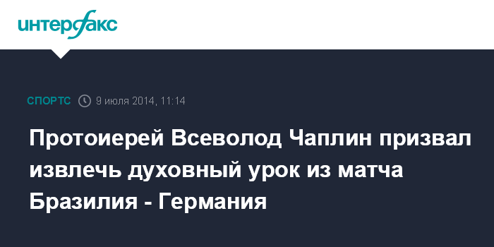 Москва. 9 июля. INTERFAX.RU - В Русской православной церкви считают поучительным результат матча Бразилия-Германия, который закончился с разгромным счетом 1:7 в пользу немцев.