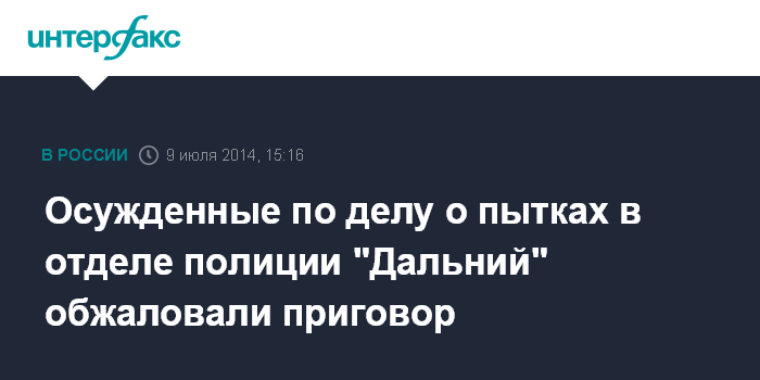 Как сообщалось, восемь фигурантов дела о пытках в ОП "Дальний" были осуждены 16 июня на сроки от 2 до 15 лет лишения свободы. В зависимости от роли каждого они признаны виновными в совершении преступлений, предусмотренных статьями 286 (превышение должностных полномочий) и 111 (причинение тяжкого вреда здоровью) УК РФ.