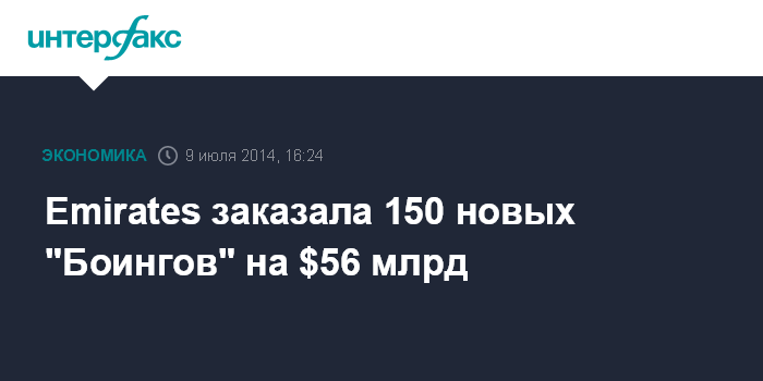 Москва. 9 июля. INTERFAX.RU - Авиакомпания Emirates Airline и Boeing в среду подтвердили информацию о размещении заказа на 150 самолетов Boeing-777X - обновленной версии популярной модельной линейки широкофюзеляжного самолета, общая каталожная стоимость воздушных судов составляет $56 млрд, пишет газета The Wall Street Journal.