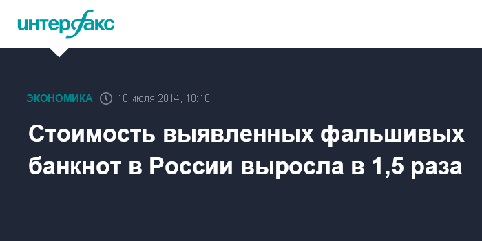 Москва. 10 июля. INTERFAX.RU - Количество выявленных фальшивых банкнот в РФ в I полугодии увеличилось по сравнению с аналогичным периодом 2013 года на 7,6% - до 38,0 тыс. с 35,37 тыс. штук, свидетельствуют материалы, опубликованные на сайте ЦБ РФ. Номинальная стоимость выявленных поддельных банкнот при этом увеличилась на 48% - до 145,45 млн рублей с 98,21 млн рублей.
