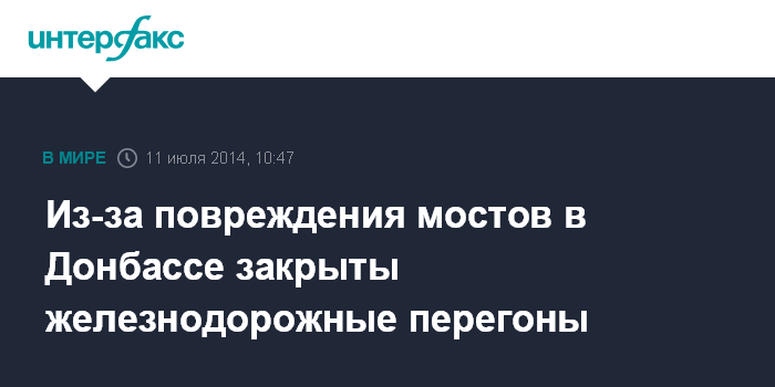 Москва. 11 июля. INTERFAX.RU - В Донецкой области из-за повреждения автомобильных мостов над железнодорожными путями приостановлено движение поездов на некоторых участках.