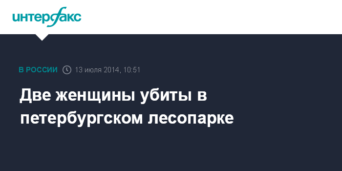 Москва. 13 июля. INTERFAX.RU - Две женщины найдены убитыми в лесопарке в Санкт-Петербурге, сообщил "Интерфаксу" источник в правоохранительных органах в воскресенье.