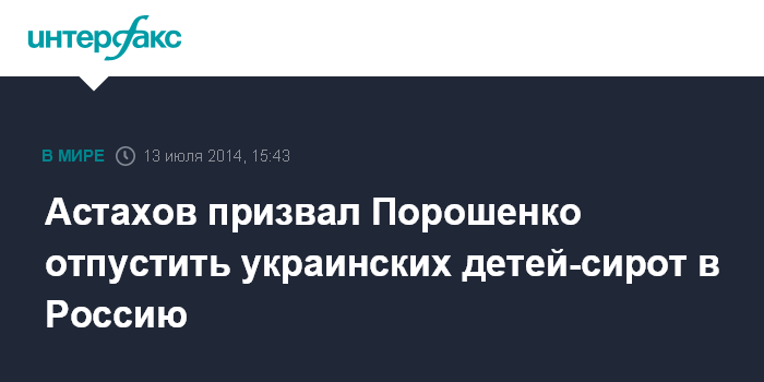 Москва. 13 июля. INTERFAX.RU - Уполномоченный по правам ребенка в РФ Павел Астахов призвал президента Украины Петра Порошенко дать возможность украинским сиротам выехать в Россию, сообщает в воскресенье пресс-служба омбудсмена.