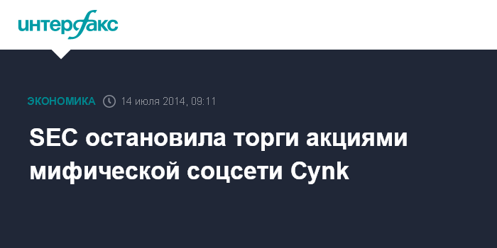 Москва. 14 июля. INTERFAX.RU - Американская Комиссия по ценным бумагам и биржам (SEC) изучает деятельность Cynk Technology Corp., социальной сети с нулевой выручкой и единственным сотрудником, капитализация которой достигла при этом фантастических $6 млрд.