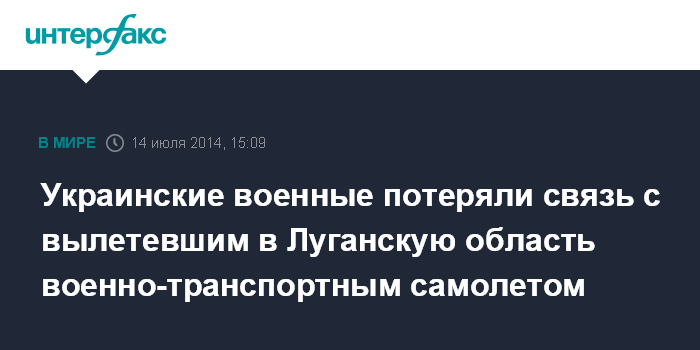 Москва. 14 июля. INTERFAX.RU - В Луганской области потеряна связь с экипажем военно-транспортного самолета Ан-26, сообщил агентству "Интерфакс-Украина" источник в военных кругах.