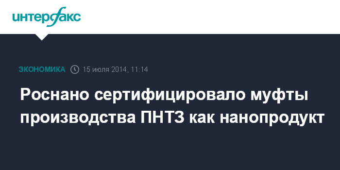 Москва. 15 июля. INTERFAX.RU – Сертификационный орган Роснано - "Наносертифика" признал муфты с термодиффузионно-цинковым (ТДЦ) покрытием для насосно-компрессорных труб (НКТ) наносодержащей продукцией, говорится в сообщении пресс-службы "Первоуральского новотрубного завода" (ПНТЗ, Свердловская область, входит в группу ЧТПЗ), который занимается производством муфт.