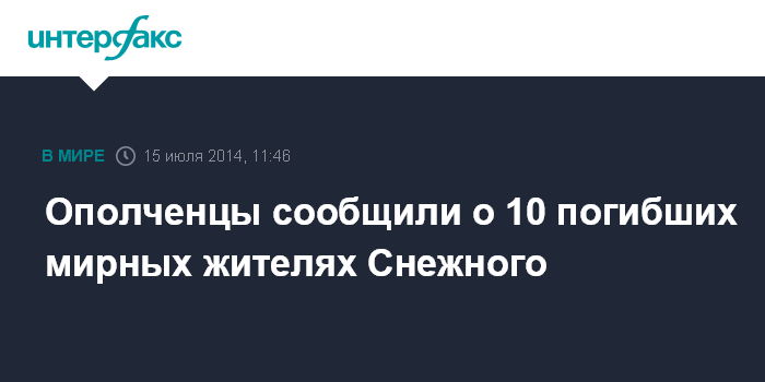 Москва. 15 июля. INTERFAX.RU - Ополченцы самопровозглашенной Донецкой народной республики сообщают о 10 погибших в результате авиаудара по украинскому городу Снежное.