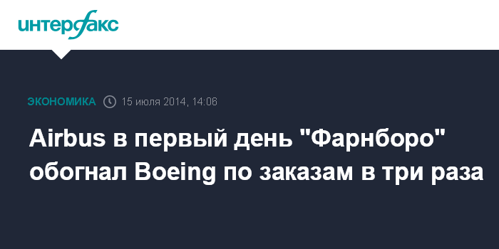 Москва. 15 июля. INTERFAX.RU - В первый день международного авиасалона в британском Фарнборо компания Airbus Group NV получила заказы на общую сумму $21 млрд, обогнав конкурента Boeing Inc. почти в три раза, сообщило агентство Bloomberg.