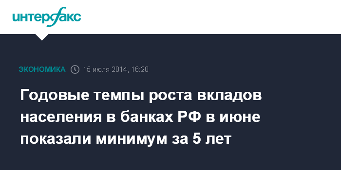Москва. 15 июля. INTERFAX.RU – Годовой прирост вкладов населения в российских банках в июне 2014 года замедлился до минимума за последние пять лет, составив всего 8%, свидетельствует обзор банковского сектора на сайте ЦБ РФ.